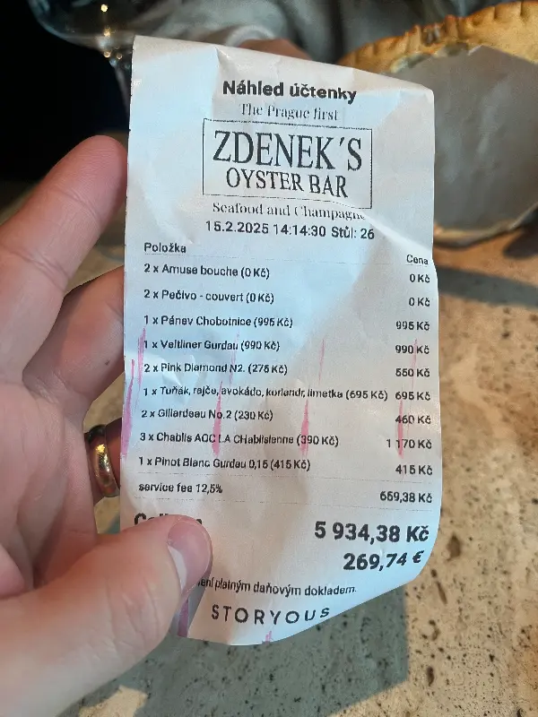 즈데넥스 오이스터 바의 가격은 평균 이상이지만, 프라하에서 신선한 해산물을 맛볼 수 있다는 점을 고려하면 합리적인 수준입니다. 밀라노나 파리와 비교했을 때 오히려 저렴하다고 느낄 수도 있습니다. 훌륭한 음식과 서비스, 그리고 특별한 분위기를 고려하면, 즈데넥스 오이스터 바에서의 식사는 충분히 가치 있는 투자입니다.