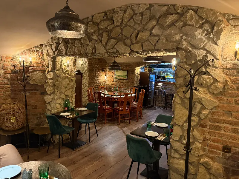 랄 킬라에 들어서는 순간, 마치 인도로 순간 이동한 듯한 착각을 불러일으킵니다. 벽돌과 돌로 마감된 인테리어는 프라하의 고풍스러운 분위기와 절묘하게 어우러져 묘한 매력을 풍깁니다. 은은한 조명 아래 놓인 테이블은 아늑하고 편안한 분위기를 자아내며, 식사에 대한 기대감을 한껏 높입니다.