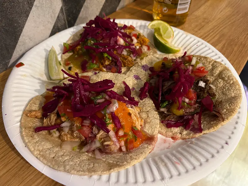 다양한 종류의 고기 선택지도 훌륭합니다. 바르바코아와 치킨 타코는 특히 인기가 높습니다. 바르바코아의 부드러운 육질과 깊은 풍미, 치킨 타코의 담백함은 신선한 적양배추와 환상적인 조화를 이룹니다.