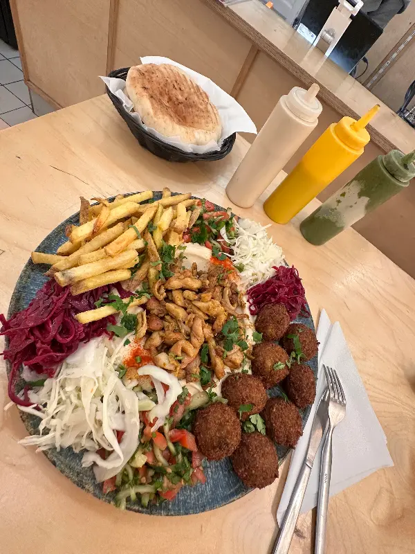 1인 메뉴로 클래식 치킨 콤보를 선택했다. 팔라펠은 겉은 바삭하고 속은 촉촉하여, 씹을수록 고소한 맛이 느껴졌다. 닭다리살로 만든 닭고기는 부드럽고 촉촉했으며, 특제 소스와의 조화가 훌륭했다. 후무스는 처음에는 맛있었지만, 시간이 지날수록 살짝 퍽퍽해지는 느낌이 있었다. 하지만 전체적으로 맛은 훌륭했으며, 양이 너무 많아서 다 먹지 못할 정도였다.