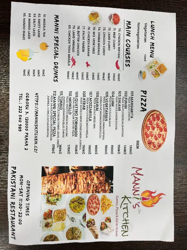 어느덧 프라하에서의 마지막 날, 낯선 도시의 골목길을 헤매다 우연히 강렬한 향신료 냄새에 이끌려 작은 식당 앞에 멈춰 섰습니다. 간판에는 “Manny’s Kitchen”이라고 적혀 있었고, 그 아래에는 “Curries, Pizza & Doner Kebab”이라는 문구가 눈에 띄었습니다. 다양한 메뉴를 취급하는 곳이었지만, 왠지 모르게 케밥에 대한 강렬한 끌림이 있었습니다. 마지막 만찬은 이곳에서 즐겨보기로 결정했습니다.