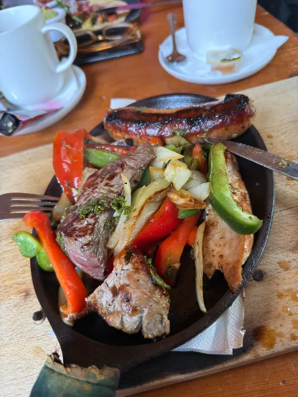 곧이어 비프 파히타가 등장했습니다. 뜨겁게 달궈진 팬 위에서 지글거리는 소리와 함께 매콤한 향이 코를 찔렀습니다. 촉촉하게 구워진 소고기와 양파, 피망 등 알록달록한 채소들이 먹음직스러운 자태를 뽐냈습니다. 따뜻한 토르티야에 고기와 채소를 듬뿍 올려, 살사 소스와 사워크림을 곁들여 한 입 가득 맛보니, 입안에서 축제가 벌어지는 듯했습니다.