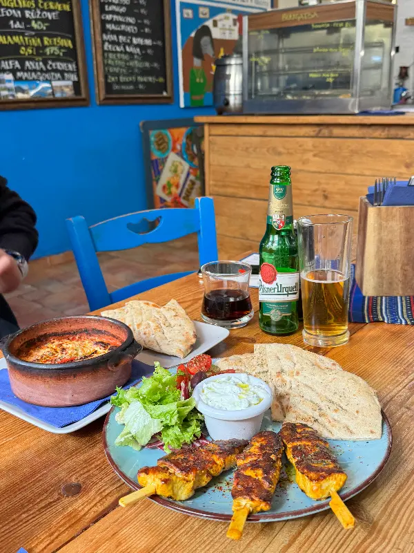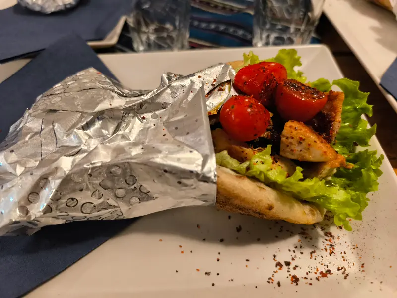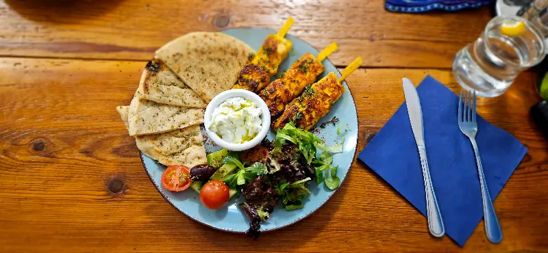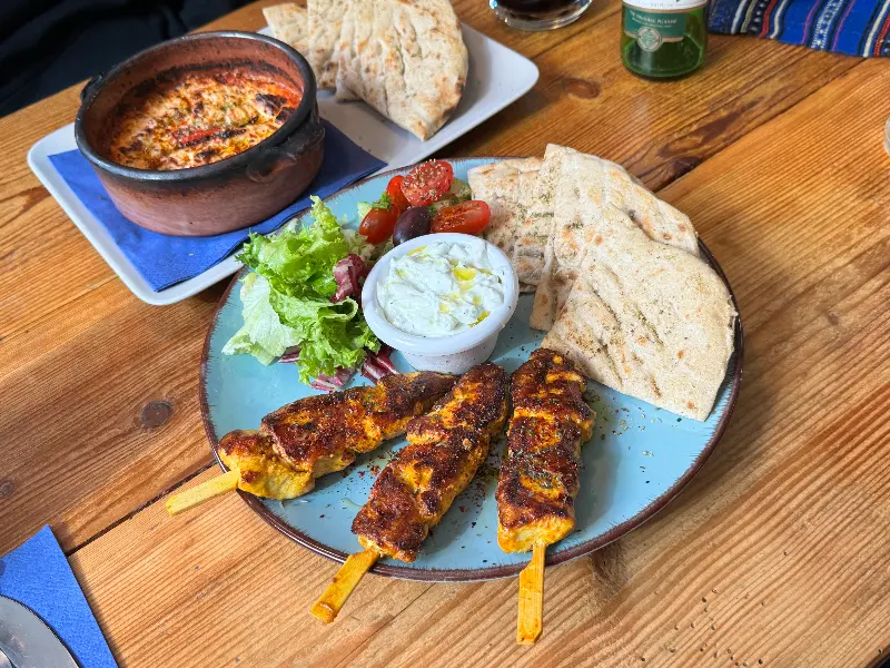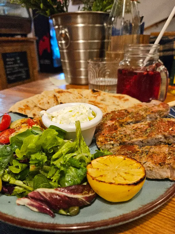 자리에 앉아 메뉴판을 펼쳐 들었다. 다양한 그리스 요리들이 눈길을 사로잡았다. 닭고기 수블라키, 돼지고기 바게트, 그리스 샐러드… 고민 끝에 직원에게 추천을 부탁했다. 그의 친절하고 진솔한 설명에 이끌려 닭고기 수블라키와 돼지고기 바게트를 주문했다. 잠시 후, 테이블 위로 음식이 놓였다. 보기만 해도 신선함이 느껴지는 채소와 따뜻하게 구워진 고기, 그리고 향긋한 소스까지, 완벽한 조화였다.