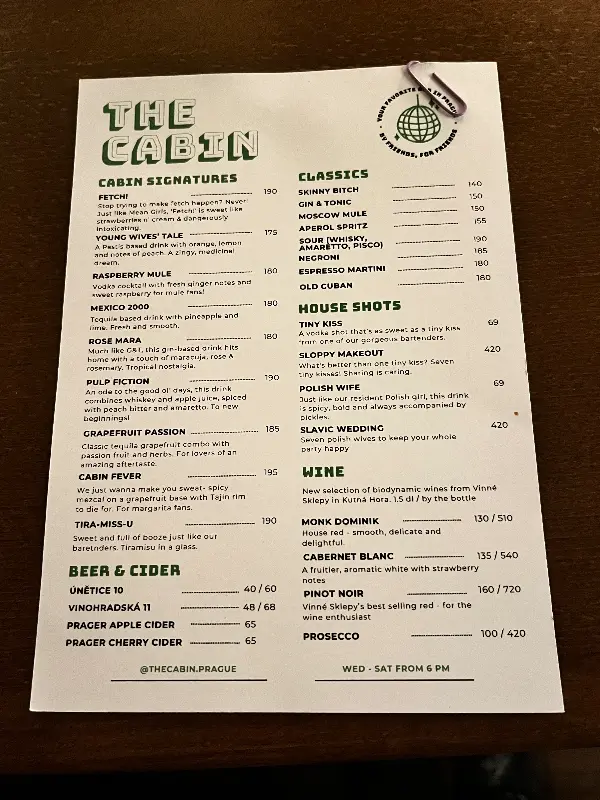 환상적인 분위기, 환상적인 사람들, 그리고 환상적인 음료까지. The Cabin은 패셔너블하고 열정적이며 친절하고 사회적 의식이 있는 사람들을 위한 최고의 장소입니다. 프라하 최고의 바를 찾는다면, The Cabin은 절대 놓쳐서는 안 될 곳입니다. 훌륭한 서비스, 세심한 바텐더, 멋진 인테리어까지, 방문객들에게 필요한 모든 것을 갖추고 있습니다.