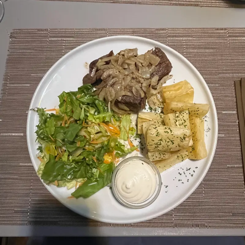 양파와 함께 구워진 스테이크는 짭짤하면서도 달콤한 맛이 일품이다.