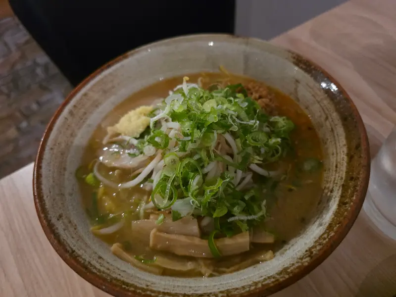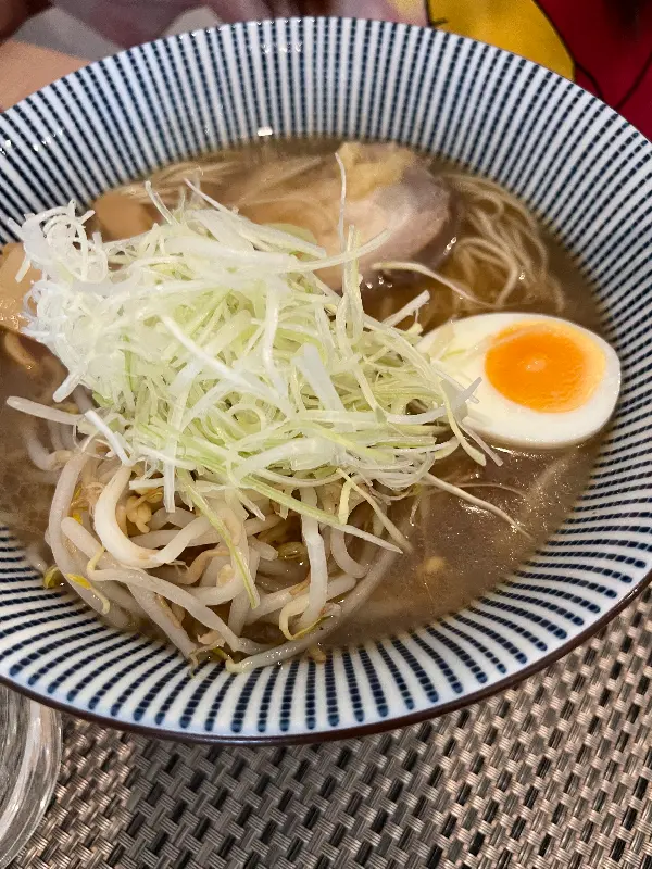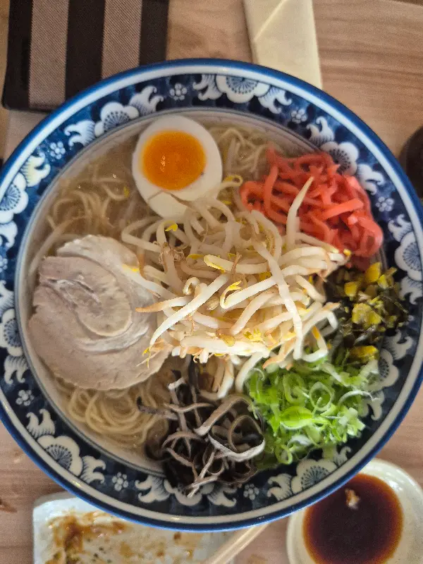 돈코츠 쇼유 라멘은 진하고 깊은 돼지 육수에 쇼유(간장)의 짭짤함이 더해져 완벽한 조화를 이루었다. 면은 탱글탱글하고 쫄깃했으며, 차슈는 입에서 살살 녹았다. 토핑으로 올라간 신선한 파와 숙주는 라멘의 풍미를 더욱 풍성하게 만들어주었다. 이미지 속 라멘처럼 검은색 그릇에 담겨 더욱 먹음직스러워 보인다.