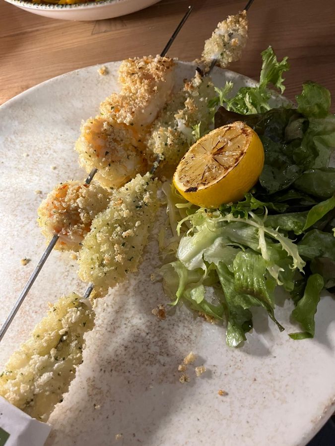 신선한 해산물을 즐기고 싶다면 튀김옷을 입혀 구워낸 새우와 오징어 스큐어스를 추천합니다. 바삭하게 튀겨진 해산물은 고소하면서도 촉촉한 식감을 자랑하며, 옆에 곁들여진 상큼한 샐러드와 그릴에 구운 레몬은 느끼함을 잡아주고 풍미를 더합니다.