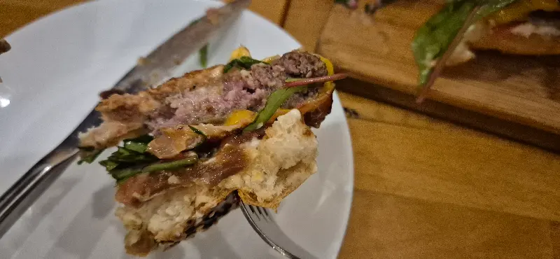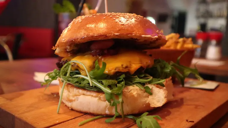 신선한 루꼴라와 치즈, 두툼한 패티가 조화롭게 쌓여 올라간 버거의 모습.
