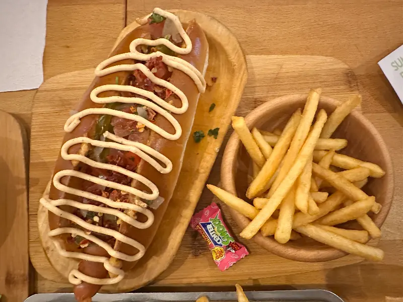 푸짐한 양의 핫도그와 바삭한 감자튀김이 함께 제공되어 든든한 한 끼 식사를 책임진다.