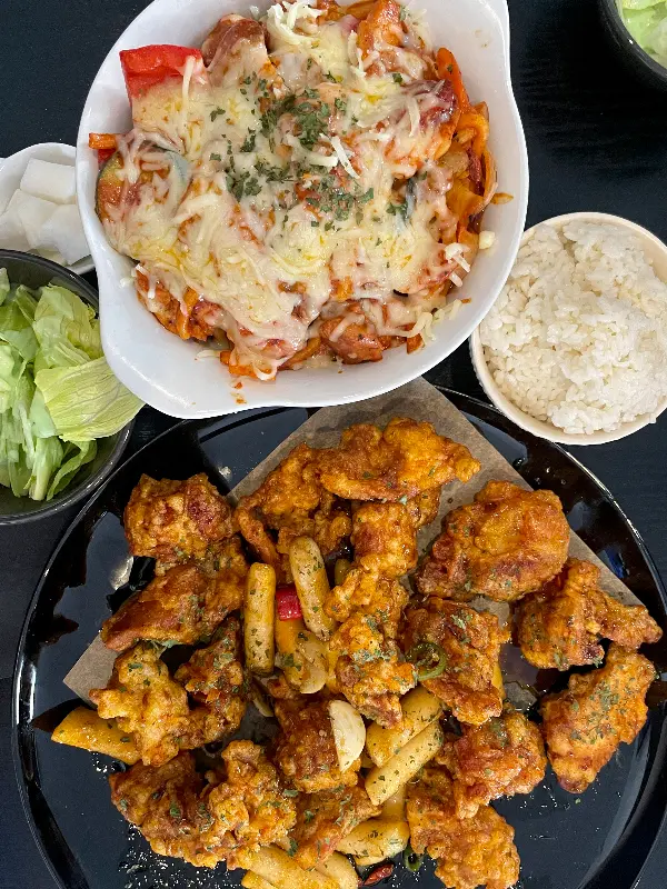 주문한 매콤간장치킨은 얇고 바삭한 튀김옷이 인상적이었다. 닭 냄새는 전혀 나지 않았고, 간장 소스의 달콤 짭짤한 맛이 입안 가득 퍼졌다. 불닭은 우동사리가 함께 제공되어 더욱 푸짐했다. 밥과 샐러드가 세트로 나와 든든한 한 끼 식사로도 손색이 없었다. 매운맛은 적당해서 부담 없이 즐길 수 있었다.