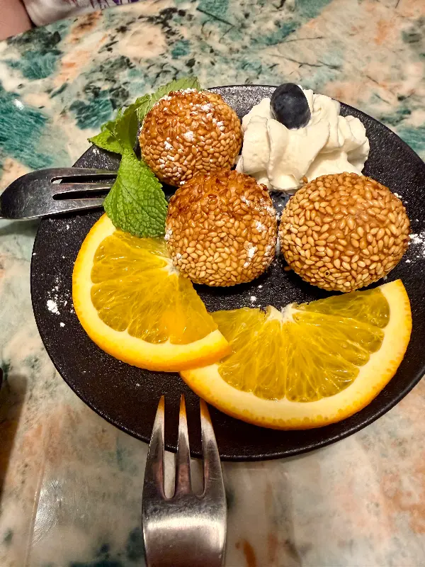 달콤한 깨경단과 상큼한 오렌지의 조화가 돋보이는 디저트.