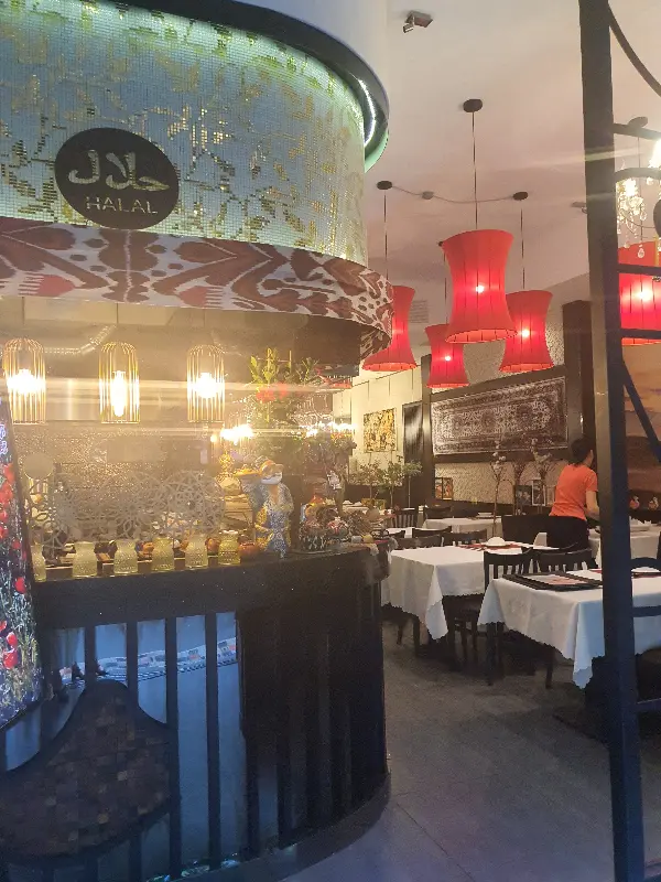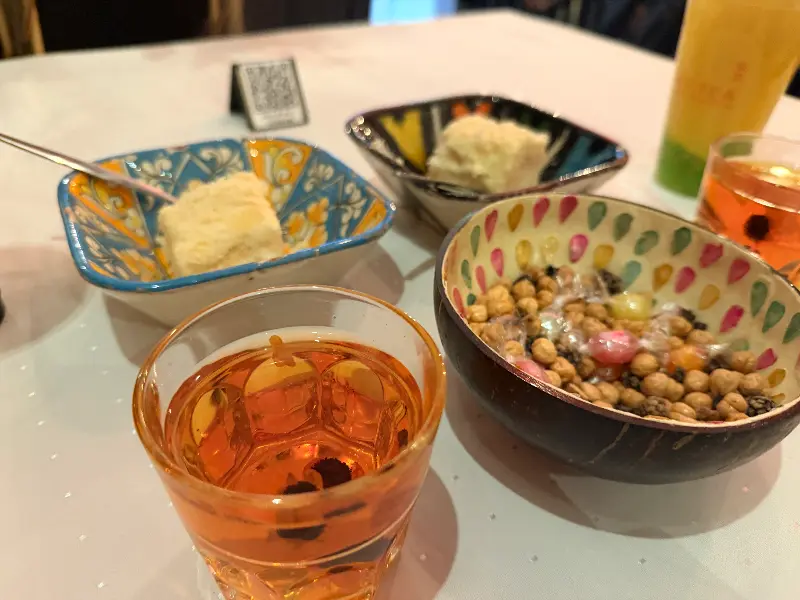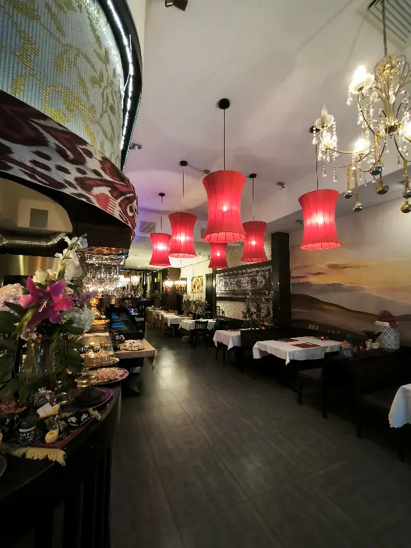 레스토랑 내부는 위구르 문화에서 영감을 받은 인테리어로 가득했다. 붉은색 조명 아래 은은하게 빛나는 벽면의 장식들과 곳곳에 놓인 전통 소품들은 눈을 즐겁게 했다. 특히, 붉은 빛깔의 독특한 조명은 공간 전체에 따뜻함과 아늑함을 더해주어 편안하게 식사를 즐길 수 있는 분위기를 조성했다.