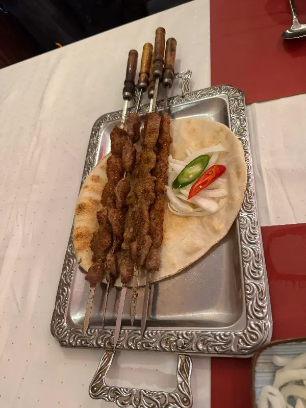 은쟁반 위에 가지런히 놓인 양꼬치는 시각적인 즐거움까지 더했다. 붉은 고추와 하얀 양파 슬라이스가 함께 제공되어, 양꼬치의 풍미를 더욱 돋보이게 했다.