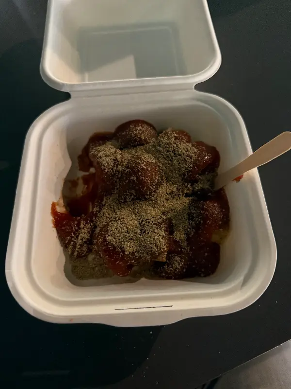 주문 후, 커리부어스트가 나오기까지는 그리 오랜 시간이 걸리지 않았습니다. 눈앞에 놓인 커리부어스트는 겉보기에도 매콤해 보였습니다. 카레 가루와 특제 소스가 듬뿍 뿌려져 있었고, 그 위에는 갈릭 후레이크가 얹어져 있었습니다. 직원분께서 “매운 거 좋아하세요?”라고 물으며 카레 가루를 듬뿍 뿌려주셨는데, 그 모습에서 장인의 손길이 느껴졌습니다.