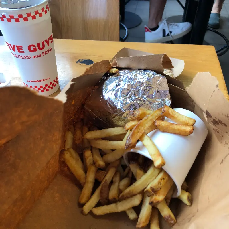 Five Guys는 프림로즈힐로 향하는 길목에 자리 잡고 있었다. 위치 선정부터 완벽하다는 생각이 들었다. “프림로즈힐 가는 길에 테이크아웃 하기 좋은 위치예요👍”라는 리뷰처럼, 나 역시 피크닉을 즐기기 위해 버거를 포장하기로 결정했다. 매장 안은 활기찬 분위기로 가득했고, 직원들의 미소 덕분에 더욱 기분이 좋아졌다. “camden주변에서 five guys를 가신다면 추천” 이라는 리뷰처럼, 접근성도 훌륭했다.