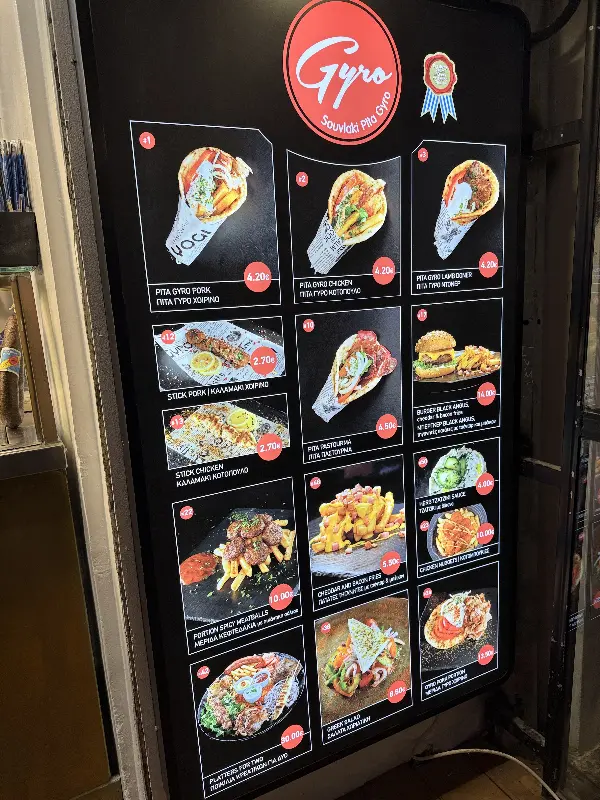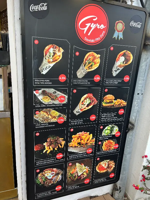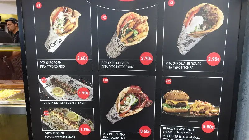 Yogi Gyro의 메뉴는 복잡하지 않다. 기로스와 수블라키, 팔라펠 등 그리스를 대표하는 음식들이 주를 이룬다. 가게 앞에 세워진 메뉴판을 보면 다양한 종류의 기로스 사진들이 눈길을 사로잡는다. 돼지고기, 닭고기 등 취향에 따라 선택할 수 있으며, 가격 또한 매우 합리적이다. 기본 기로스는 단돈 2.5유로부터 시작한다니, 주머니 사정이 넉넉지 않은 여행자에게는 더할 나위 없이 반가운 소식이다.