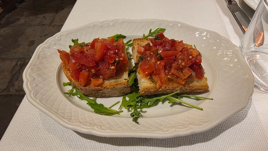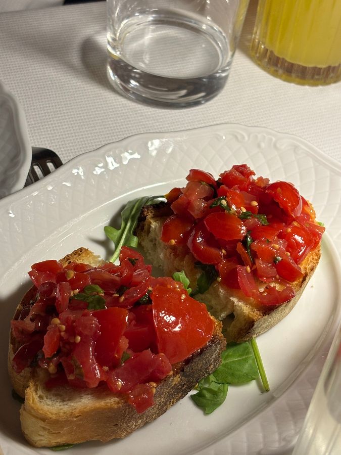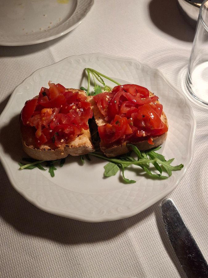 또 다른 스타터로 주문한 브루스케타는 바삭하게 구워진 빵 위에 잘게 다진 신선한 토마토가 듬뿍 올라가 있었습니다. 한입 베어 물면 톡 터지는 토마토의 육즙과 허브의 향긋함이 어우러져 이탈리아의 태양을 머금은 듯한 신선함을 그대로 전해줍니다. 깔끔하고 정갈한 흰색 접시에 담겨 나온 브루스케타는 식사의 시작을 알리는 완벽한 서곡이었습니다. 와인 한 잔과 함께 즐기기에 이보다 더 좋은 조합은 없을 것입니다.