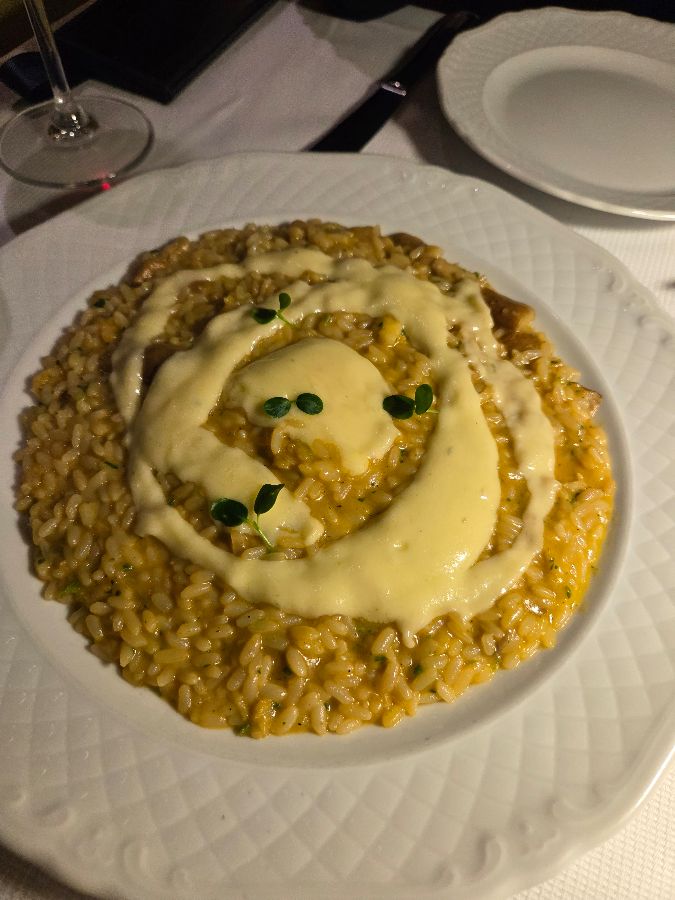 파스타 외에도 리조또는 그 자체로 하나의 예술 작품 같았습니다. 황금빛 리조또 위에 우유 거품처럼 부드러운 치즈 소스가 소용돌이 모양으로 예쁘게 장식되어 나왔습니다. 리조또는 깊은 감칠맛과 부드러운 식감이 일품이었고, 작은 허브 잎이 더해져 신선한 향미를 더했습니다. 따뜻하고 진한 풍미가 느껴지는 리조또는 피렌체에서의 잊지 못할 저녁 식사를 더욱 풍성하게 만들어 주었습니다.