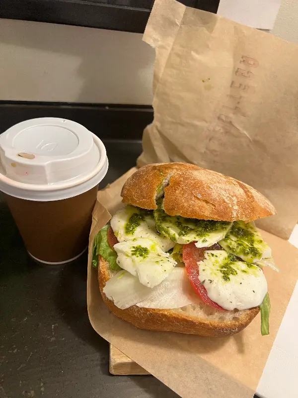 신선한 모짜렐라 치즈와 토마토, 바질 페스토의 조화가 돋보이는 파니니. 밥스의 대표 메뉴 중 하나입니다.