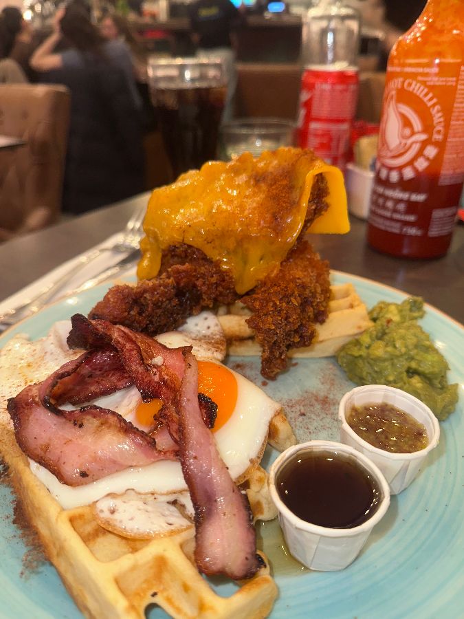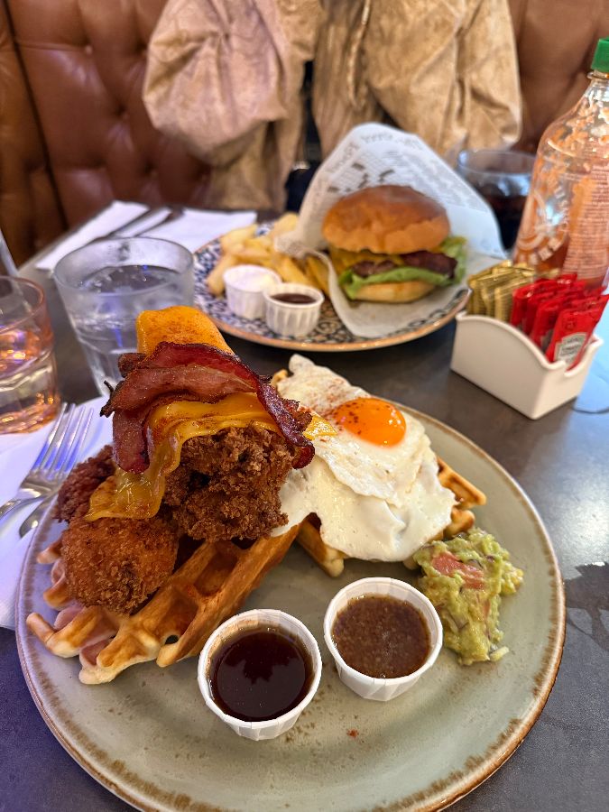 드디어 주문한 음식들이 테이블에 차려지기 시작했습니다. 가장 먼저 시선을 사로잡은 것은 ‘치킨 와플’이었습니다. 바삭하게 튀겨진 치킨 위에 멜팅 치즈가 흘러내리고, 그 아래에는 따끈하고 폭신한 와플이 겹겹이 쌓여 있었습니다. 옆으로는 노릇하게 구워진 베이컨과 완벽하게 익힌 계란 프라이, 신선한 아보카도 과카몰리, 그리고 달콤한 메이플 시럽이 작은 종지들에 담겨 나왔습니다.