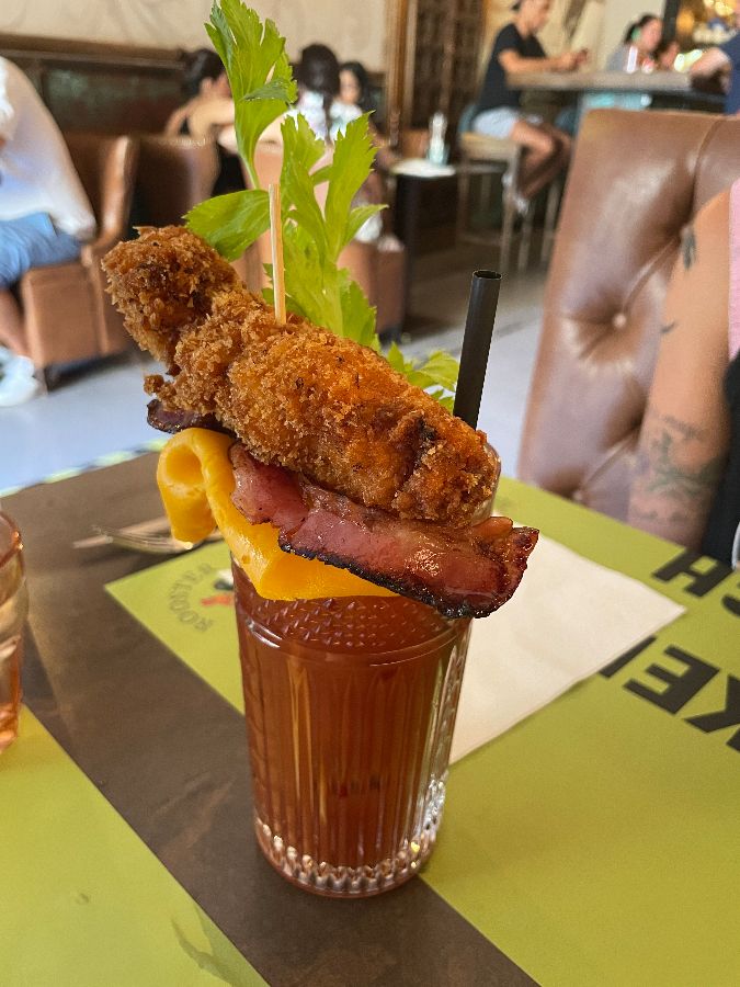 루스터 다이너는 음식만큼이나 음료에도 특별한 정성을 기울였습니다. 추천받아 주문한 드링크는 시각적으로도 아름다웠지만, 입안 가득 퍼지는 상큼하고 달콤한 맛에 목마름이 싹 가셨습니다. 특히 해장술로 시켰다는 블러디 메리에는 치킨, 치즈, 베이컨이 꼬지로 꽂혀 나오는 재미있는 비주얼로 모두를 폭소케 했습니다. 친구가 비건이라 치킨은 제가 대신 먹었다는 에피소드는, 이곳의 재치와 넉넉한 인심을 엿볼 수 있는 대목이었죠.