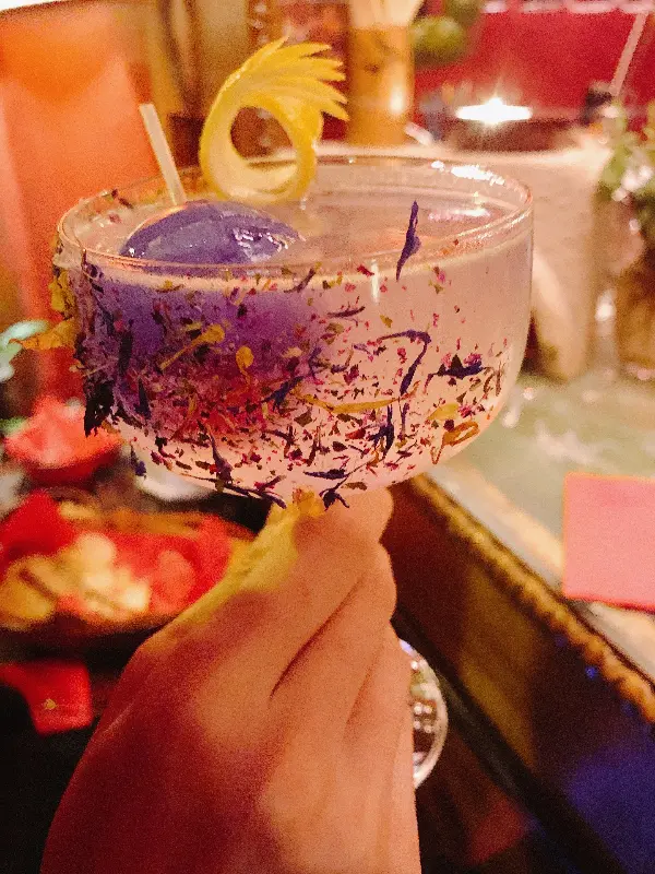 함께 간 친구는 “Primavera”라는 칵테일을 주문했습니다. Primavera는 이탈리아어로 ‘봄’이라는 뜻인데, 이름처럼 화려한 비주얼을 자랑하는 칵테일이었습니다. 꽃잎이 칵테일 잔 주변에 장식되어 있었고, 마치 꽃밭에 앉아 있는 듯한 기분을 선사했죠.