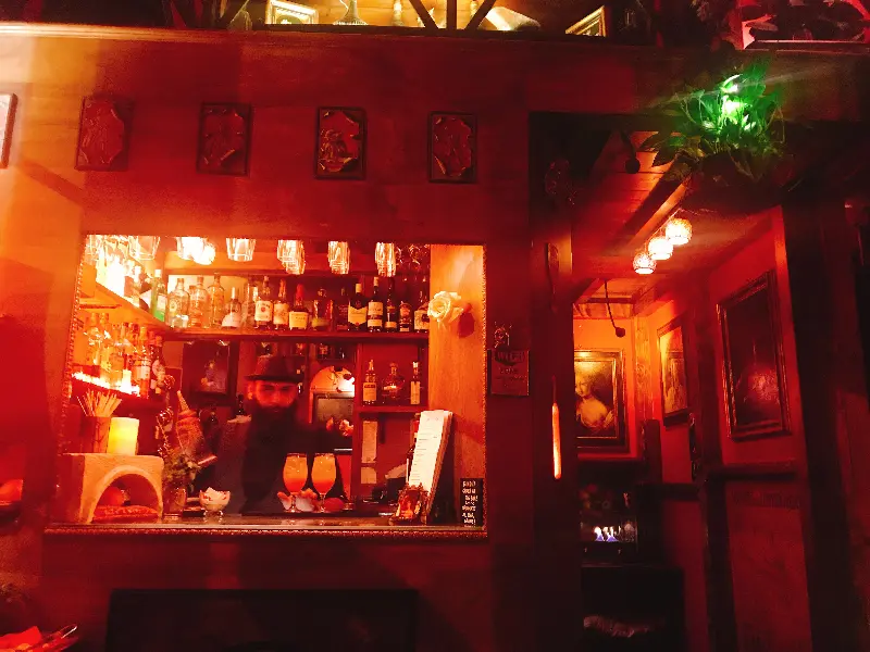 바 내부는 다채로운 색감으로 가득 차 있었습니다. 붉은 벽돌 벽에는 다양한 그림들이 걸려 있었고, 앤티크한 가구들과 소품들이 공간을 더욱 풍성하게 만들어주었습니다. 마치 작은 갤러리에 온 듯한 느낌도 들었죠.