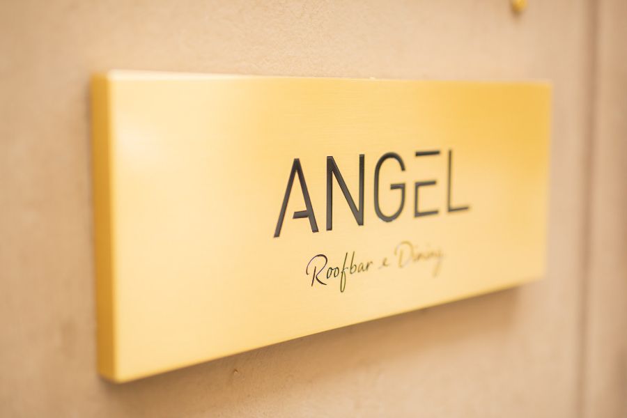 황금빛으로 빛나는 ‘ANGEL Roofbar & Dining’ 간판이 방문객을 맞이합니다.