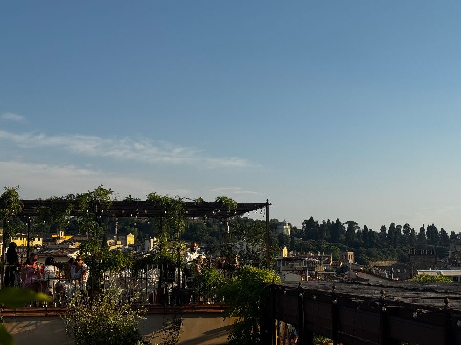 테라스에 마련된 편안한 좌석에서 방문객들이 담소를 나누고 있습니다. 뒤로는 피렌체의 아름다운 야경이 펼쳐집니다.