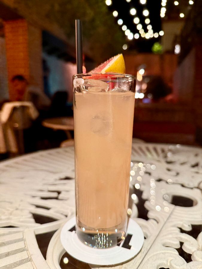 아름다운 붉은색 칵테일이 세련된 잔에 담겨 있습니다. 루프탑의 분위기와 어우러져 더욱 특별한 맛을 선사합니다.