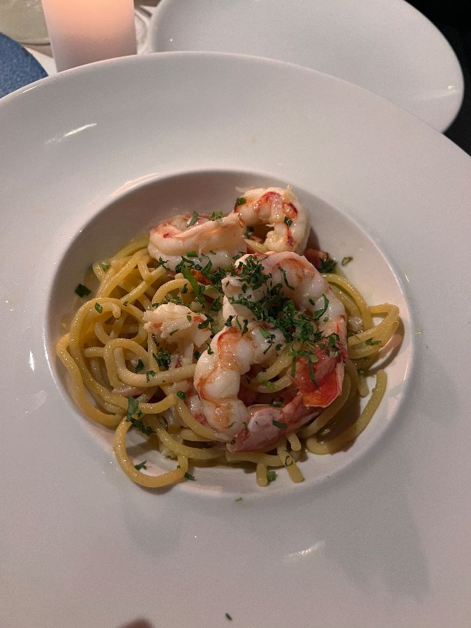 탱글탱글한 새우와 신선한 파슬리가 듬뿍 올라간 새우 파스타. 먹음직스러운 비주얼이 식욕을 자극합니다.