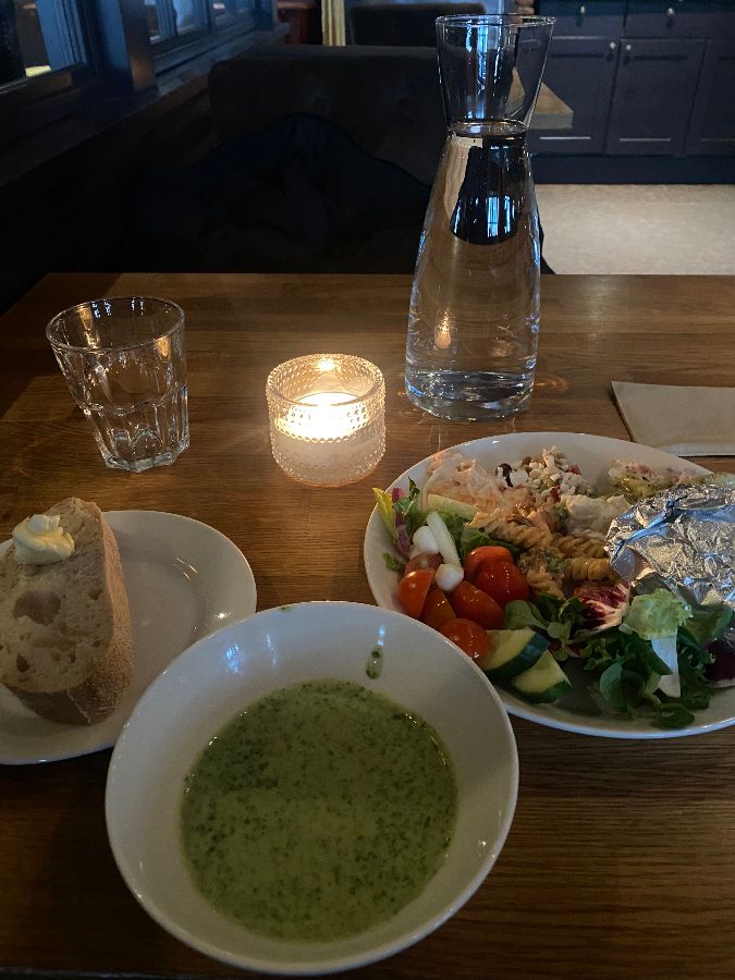 식사를 시작하기 전, 북극의 추위를 녹여줄 따뜻한 수프 한 그릇은 필수입니다. Aurora Feast의 전통 연어 수프는 많은 이들에게 극찬받는 메뉴입니다. 뽀얀 크림 육수에 신선한 연어 조각과 부드러운 감자, 그리고 향긋한 허브가 어우러진 이 수프는 한 입 맛보는 순간 몸속 깊숙이 따뜻함이 퍼지는 것을 느낄 수 있습니다. 어떤 이들은 크림처럼 진하고 느끼하게 느껴질 수도 있다고 평했지만, 바로 그 풍부하고 진득한 질감이야말로 추운 겨울밤을 위한 완벽한 위로가 되어줍니다. 갓 구운 빵과 함께 제공되는 이 수프는 메인 요리가 나오기 전 입맛을 돋우는 훌륭한 시작점이 됩니다. 점심 뷔페에서도 이 연어 수프와 함께 신선한 샐러드, 파스타, 그리고 다양한 사이드 디쉬가 준비되어, 합리적인 가격에 풍성한 미식을 즐길 수 있습니다.