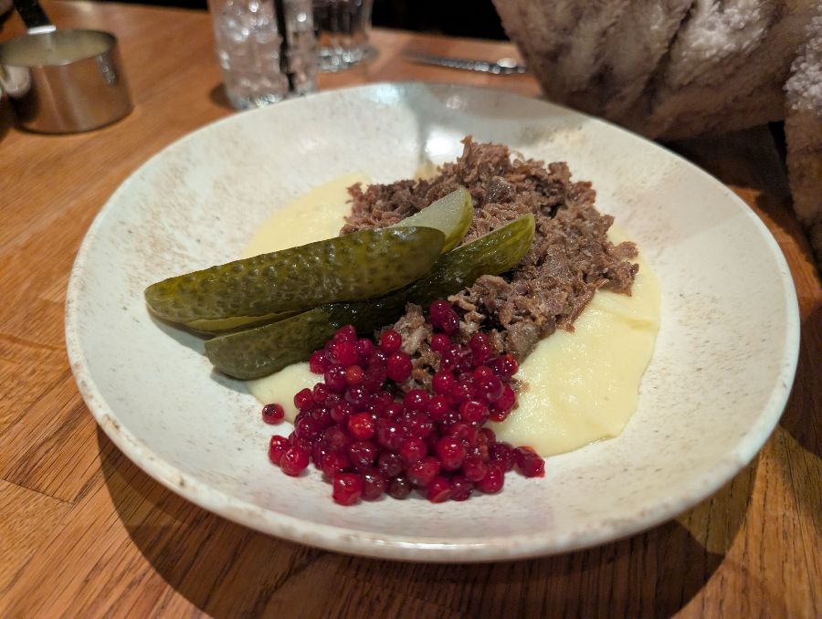 순록 립 역시 “최고”라는 찬사를 받으며, 뼈에서 부드럽게 분리되는 살코기는 깊은 맛과 부드러운 식감을 자랑합니다. 진한 소스와 함께 제공되는 순록 립은 고기를 사랑하는 미식가들에게 잊지 못할 만족감을 선사합니다. (Image 7) 순록 고기의 독특하면서도 고소한 풍미는 북극의 청정한 자연을 그대로 담아낸 듯하며, 한 입 한 입이 특별한 경험으로 다가옵니다. 이곳의 순록 요리는 단순히 이색적인 재료를 넘어, 셰프의 장인정신과 정성이 담긴 하나의 예술 작품과 같습니다.