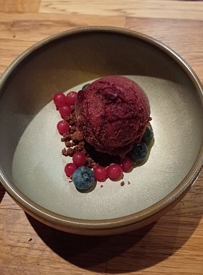 메인 식사로 충분히 만족한 후에도, Aurora Feast의 디저트는 또 다른 즐거움을 선사합니다. 식사의 대미를 장식하는 달콤한 디저트는 북극의 신선한 베리류를 활용한 상큼한 메뉴들이 많습니다. 진한 베리 소르베는 상큼하면서도 시원하여 입안을 개운하게 만들어주며, 붉은 커런트와 블루베리, 그리고 바삭한 크럼블이 어우러져 시각적으로도 즐거움을 줍니다. (Image 5) 특히 생일을 맞은 손님에게 제공되는 특별한 디저트는 노란색 아이스크림과 초콜릿 베이스, 그리고 촛불이 어우러져 더욱 감동적인 순간을 만들어냅니다. (Image 8) 이처럼 Aurora Feast는 식사의 시작부터 끝까지, 그리고 그 후의 여운까지 완벽하게 책임지는 곳입니다.
