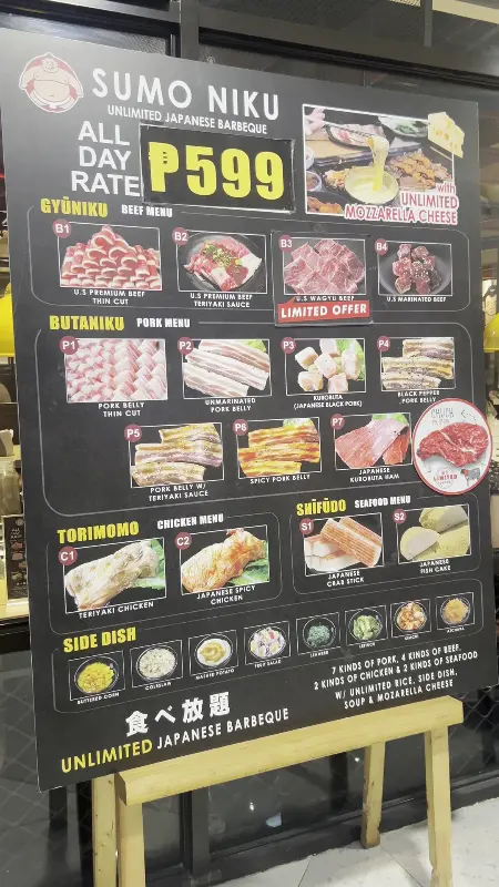메뉴판을 펼쳐보니, 다양한 종류의 고기들이 눈길을 사로잡는다. 와규부터 돼지고기, 닭고기까지, 없는 게 없다. 뷔페식이라 원하는 부위를 마음껏 즐길 수 있다는 점이 매력적이다. 스모 니쿠의 메뉴판 사진을 보니 더욱 기대감이 증폭된다. 599페소라는 가격이 무색할 정도로 풍성한 구성이다. 다양한 부위의 소고기와 돼지고기가 사진 속에 담겨있다. 치즈를 무한으로 제공한다는 문구도 눈에 띈다.