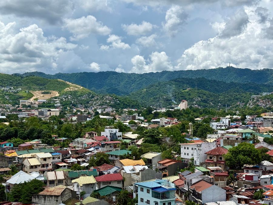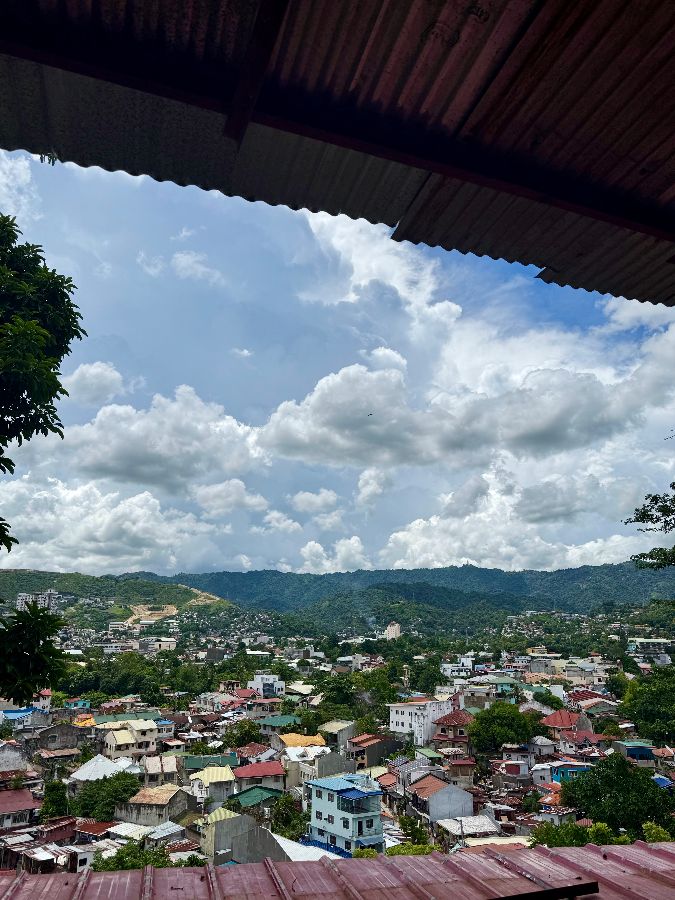 하치미츠의 가장 큰 매력 중 하나는 단연 압도적인 전망입니다. 창가 자리나 테라스로 향하는 순간, 눈앞에 펼쳐지는 풍경에 저도 모르게 탄성을 지르게 됩니다. 수많은 집들이 다채로운 지붕 색을 뽐내며 옹기종기 모여 있는 도시의 모습은 마치 한 폭의 그림 같았고, 그 너머로는 울창한 숲으로 뒤덮인 푸른 언덕과 산들이 아득하게 펼쳐져 있었습니다. 흐린 날씨에도 불구하고 구름 사이로 비추는 햇살은 도시 전체를 더욱 생동감 있게 만들었죠.