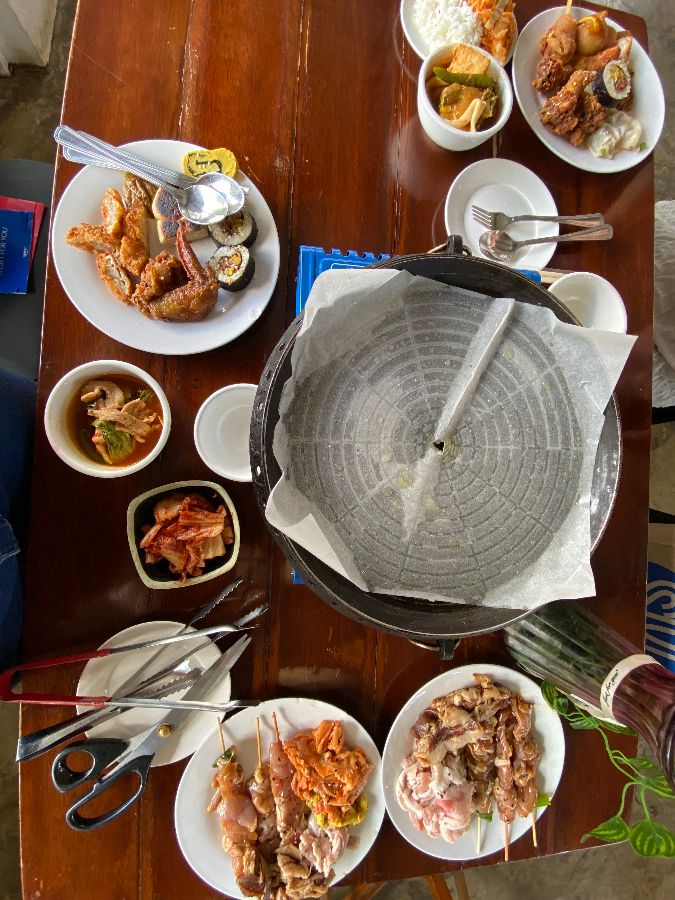 이미지에서 볼 수 있는 맑은 국물에 담긴 만두나 어묵 같은 요리, 그리고 먹음직스러운 롤 계란말이와 꼬치 요리들은 이러한 아시안 퓨전의 정체성을 잘 보여줍니다. 뷔페식으로 제공되는 밥과 고기 요리들 역시 한국인의 입맛에 친숙하면서도, 현지 식재료와 조리법이 가미되어 새로운 미식 경험을 제공합니다.