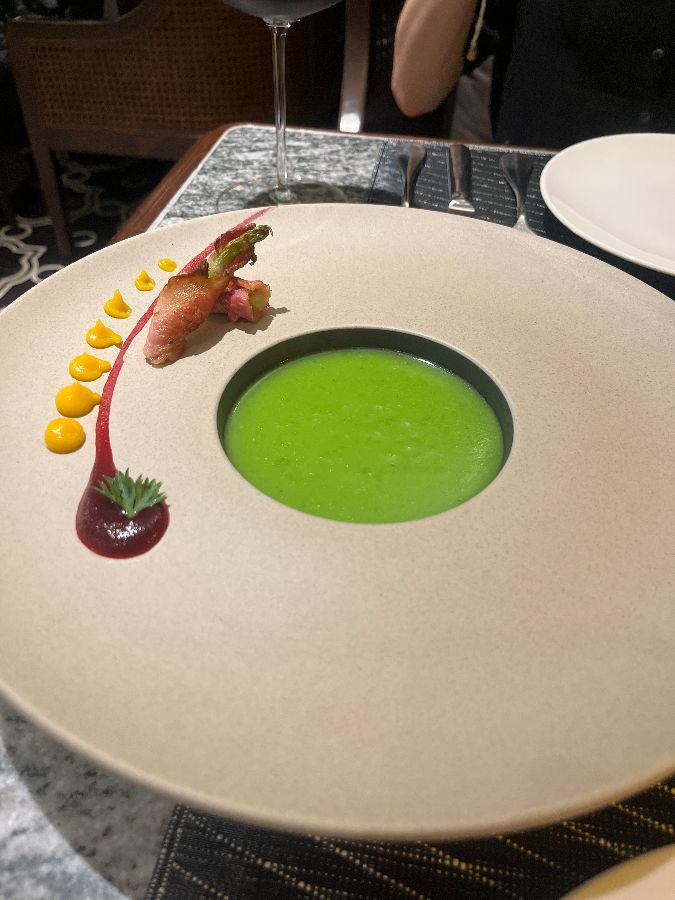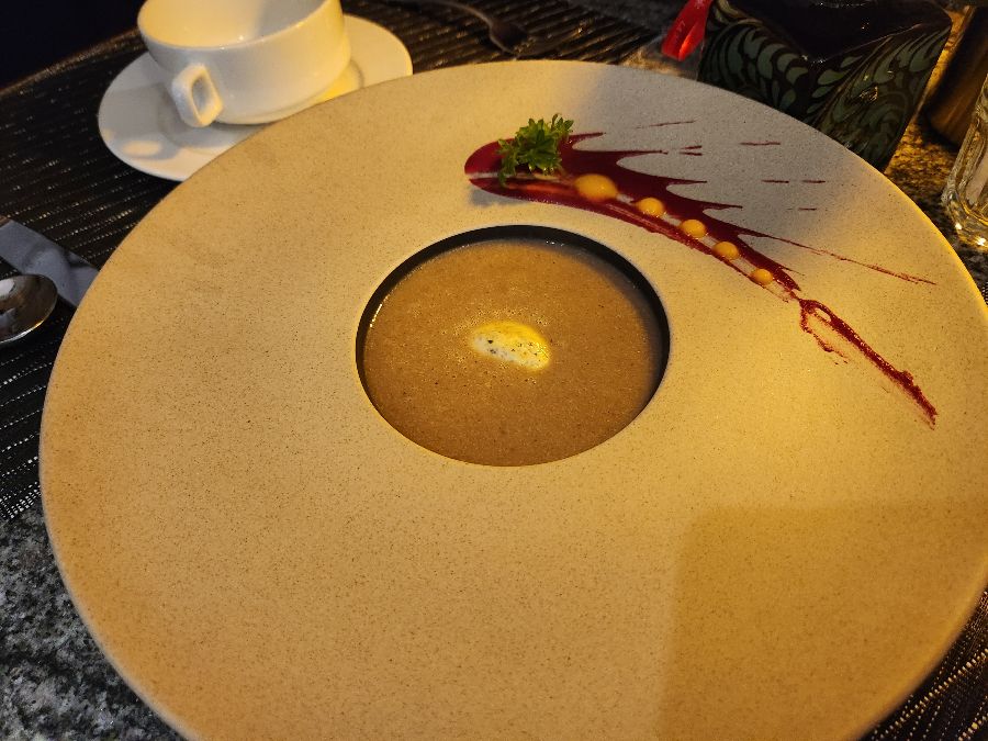 메인 요리 중에서도 단연 돋보이는 것은 스테이크입니다. 완벽하게 구워진 스테이크는 촉촉한 육즙을 가득 머금고 있으며, 부드러운 아스파라거스와 달콤한 당근이 곁들여져 맛의 균형을 이룹니다. 한 조각을 입에 넣으면 진한 육향이 입안 가득 퍼지며, 혀끝을 감도는 풍미는 잊을 수 없는 경험을 선사합니다. 미니 국자에 담긴 소스는 스테이크의 맛을 더욱 풍성하게 만들어주는 역할을 합니다.