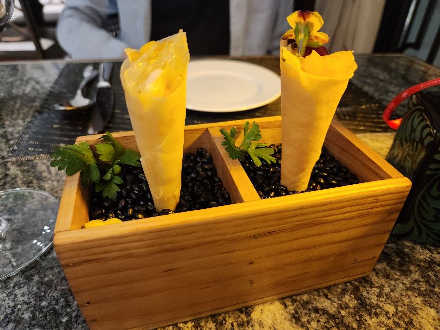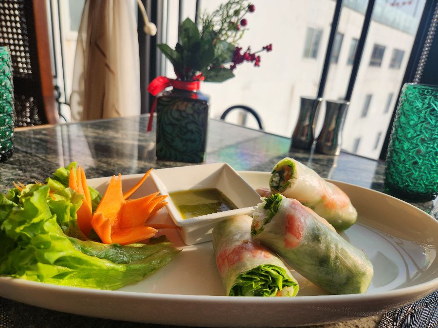 본격적인 식사에 앞서, 미각을 깨우는 애피타이저의 등장은 언제나 설레는 순간입니다. [레스토랑/스카이바 이름]의 스프링롤은 투명하고 쫄깃한 라이스페이퍼 안에 신선한 채소와 통통한 새우가 조화롭게 어우러져 있습니다. 한 입 베어 물면 아삭한 채소의 식감과 상큼한 소스가 입안 가득 퍼지며, 메인 요리에 대한 기대감을 한층 높여줍니다.