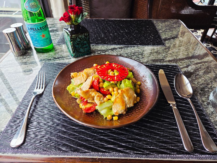 샐러드 또한 신선한 채소와 닭가슴살, 옥수수 등의 다채로운 재료가 어우러져 풍부한 맛과 식감을 선사합니다. 특히 붉은색 고리 모양의 장식은 샐러드에 예술적인 감각을 더해주어, 눈으로 먼저 즐기는 즐거움을 선사합니다.
