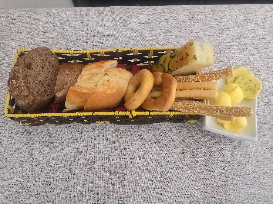 다양한 종류의 식전 빵이 푸짐하게 담긴 바구니와 함께 향긋한 허브 버터, 그리고 발사믹 드레싱이 제공됩니다. 빵 하나하나의 고유한 맛을 즐기기에 충분합니다.