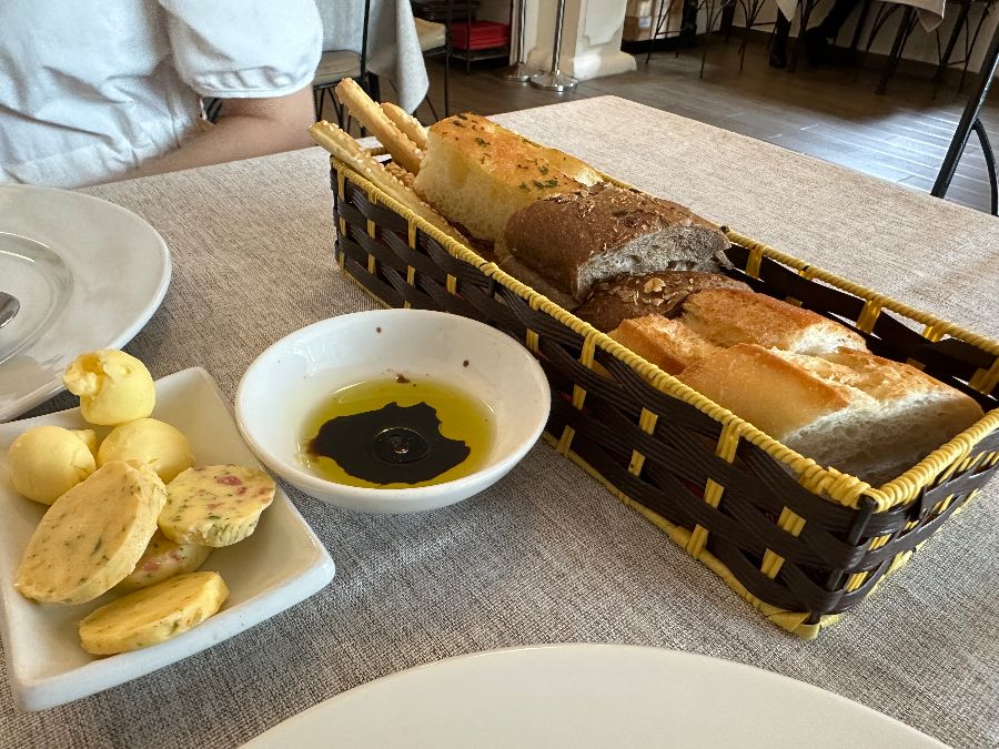 다채로운 식전 빵과 함께 제공되는 허브 버터, 그리고 발사믹 드레싱입니다. 각기 다른 빵의 맛을 더욱 풍성하게 해주는 조합입니다.