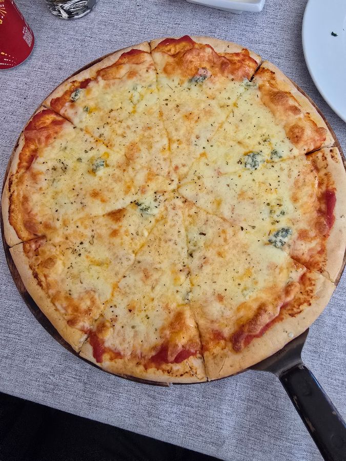 노릇하게 구워진 도우 위에 치즈가 풍성하게 올라간 고르곤졸라 피자입니다. 얇고 바삭한 도우와 고소한 치즈의 조화가 일품입니다.