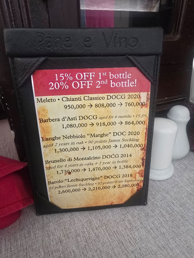 와인셀러에 가득한 다양한 와인들은 양고기뿐만 아니라 다른 이탈리안 요리와도 훌륭한 페어링을 이룹니다. 소믈리에의 추천을 받아 자신에게 맞는 와인을 선택하는 재미도 쏠쏠합니다. 맛있는 음식과 훌륭한 와인, 그리고 로맨틱한 분위기가 어우러져 Pane Vino에서의 식사는 단순한 한 끼를 넘어 특별한 추억으로 남을 것입니다.