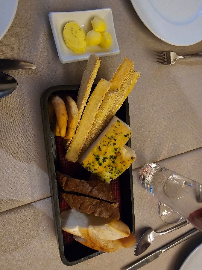 자리에 앉아 메뉴를 고르는 동안, 가장 먼저 식탁에 오르는 것은 따뜻한 식전 빵입니다. 바삭하게 구워진 바게트, 담백한 곡물 빵, 그리고 고소한 깨가 뿌려진 스틱 빵까지, 다양한 종류의 빵들이 먹음직스러운 바구니에 담겨 나옵니다. 갓 구워져 온기가 남아 있는 빵들은 겉은 바삭하고 속은 촉촉하여, 식사 시작 전 입맛을 돋우기에 완벽합니다. 특히, 별도로 요청하면 제공되는 발사믹 드레싱은 빵의 풍미를 한층 더 끌어올려줍니다.