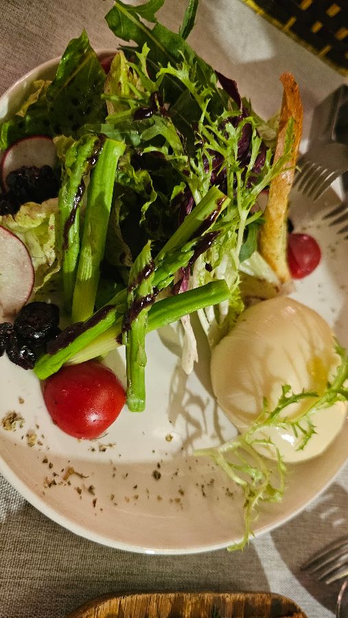 신선한 채소와 부라타 치즈, 아스파라거스가 조화롭게 어우러진 샐러드입니다. 발사믹 드레싱이 더해져 상큼한 맛을 선사합니다.
