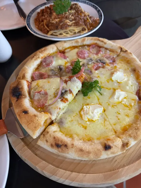 주문한 피자가 테이블에 놓이는 순간, 고소한 치즈와 풍성한 토핑의 향이 코를 자극합니다. 노릇하게 구워진 도우 위에는 쫀득하고 크리미한 치즈와 육즙 가득한 소시지가 듬뿍 올려져 있습니다. 한 조각을 들어 입에 넣는 순간, 입 안 가득 퍼지는 풍미는 그야말로 황홀경! 특히 이곳의 치즈는 다른 곳에서는 맛볼 수 없는 특별한 맛을 자랑합니다.
