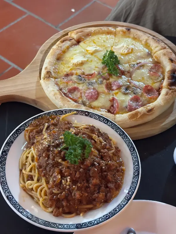 피자와 스파게티의 환상적인 조합. 풍성한 맛과 향이 입안 가득 퍼집니다.