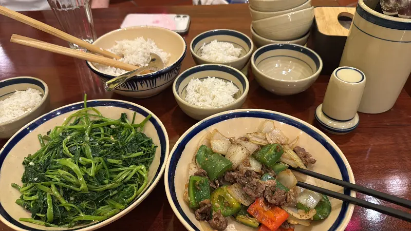 나는 이곳에서 다양한 음식을 맛보았다. 그중에서도 가장 인상 깊었던 것은 물시금치와 소고기 요리였다. 약간 짠 듯했지만, 묘하게 끌리는 맛이었다. 신선한 물시금치의 아삭한 식감과 부드러운 소고기의 조화는 환상적이었다.