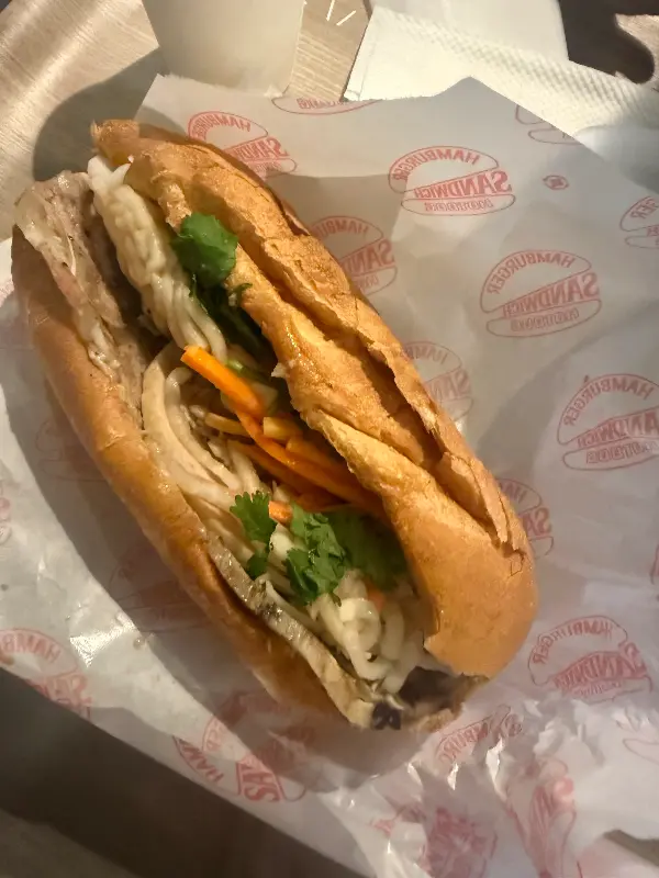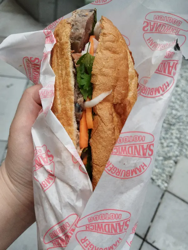 주문한 바인미가 드디어 내 손에 들어왔다. 바삭하게 구워진 바게트 빵은 보기만 해도 군침이 돌았다. 빵을 감싸고 있는 포장지에는 “HAMBURGER SANDWICH”라는 문구가 반복적으로 새겨져 있어, 바인미를 햄버거처럼 간편하게 즐길 수 있도록 디자인한 센스가 돋보였다.